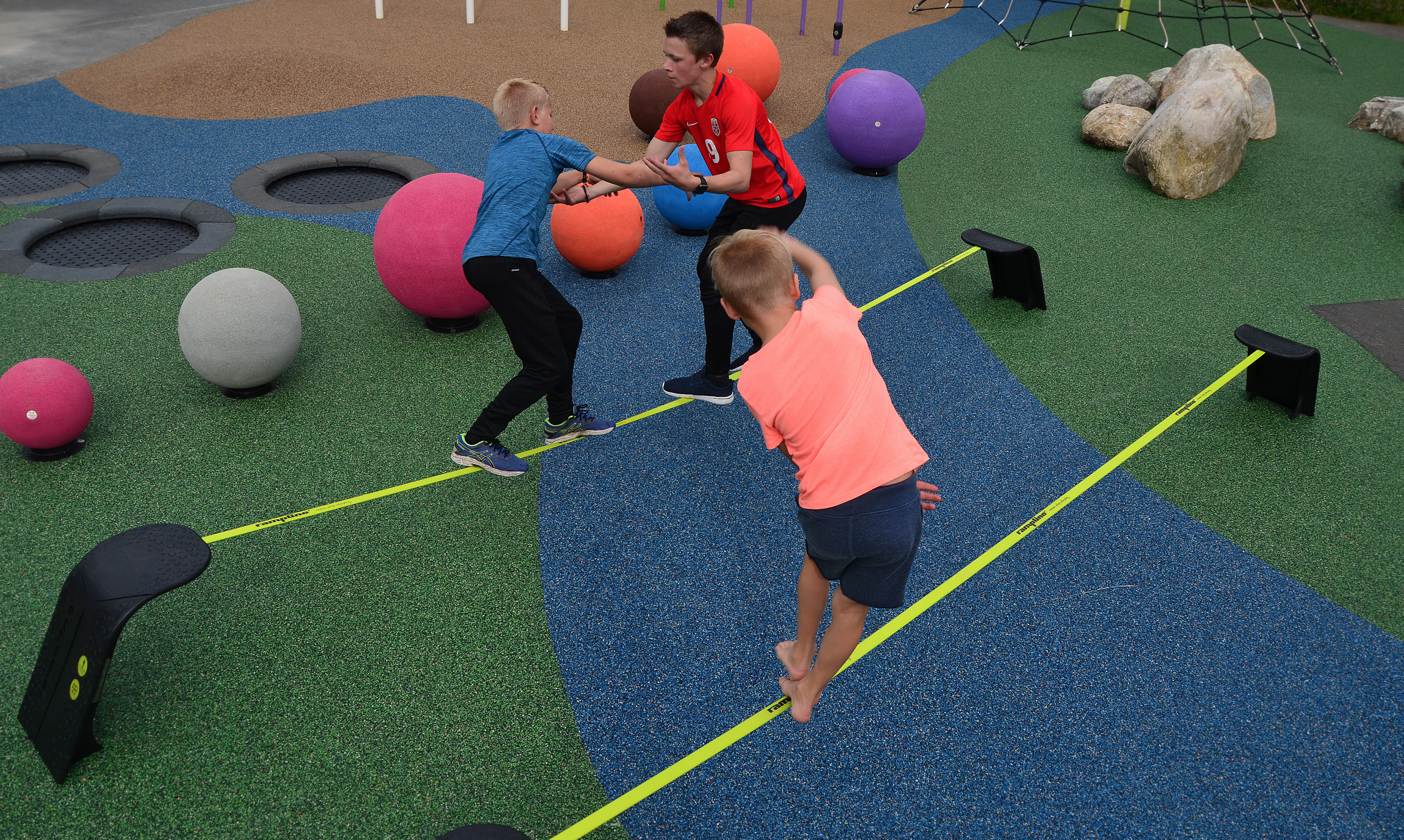 Rampline ist ein norwegisches Unternehmen, das Aktivitäts- und Spielgeräte entwickelt hat, die den Fokus auf die Förderung von Balance und motorischen Fähigkeiten legen und gleichzeitig Spaß und Spannung bieten. Und wenn diese Geräte in einem Motorikspielplatz miteinander kombiniert werden, kann der Nutzer sie auf verschiedene Arten kombinieren. Sie können eine kleine Hindernisbahn bilden, oder der Nutzer kann sich selbst herausfordern, indem er von Gerät zu Gerät springt.