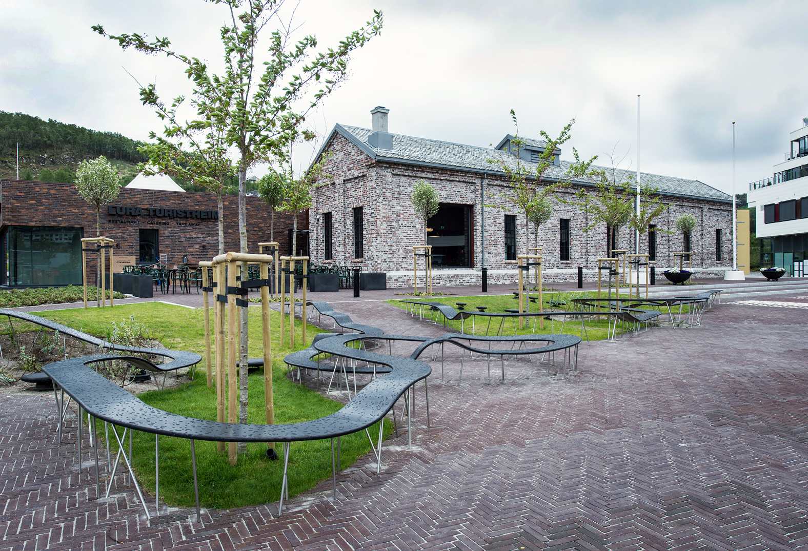 Ninety meters of levitating benches and jump pads are placed in a delightful company with water ponds, grass, trees, willow bushes and paving stones. The park in Ålgård city center invites young and old to creative play, movement and new experiences. The park is designed by ATSITE and Brandsberg-Dahls arkitekter who, in collaboration with Rampline, have developed the Floating Bench™ concept. The turns and waves of the Floating Bench™ challenge balance and coordination. It facilitates movements such as running, balancing, jumping, dancing, standing on hands, stepping, tumbling and gymnastics. The benches create playful lines that capture interest, and they are woven into the space in a way that visually connects the square and the park.