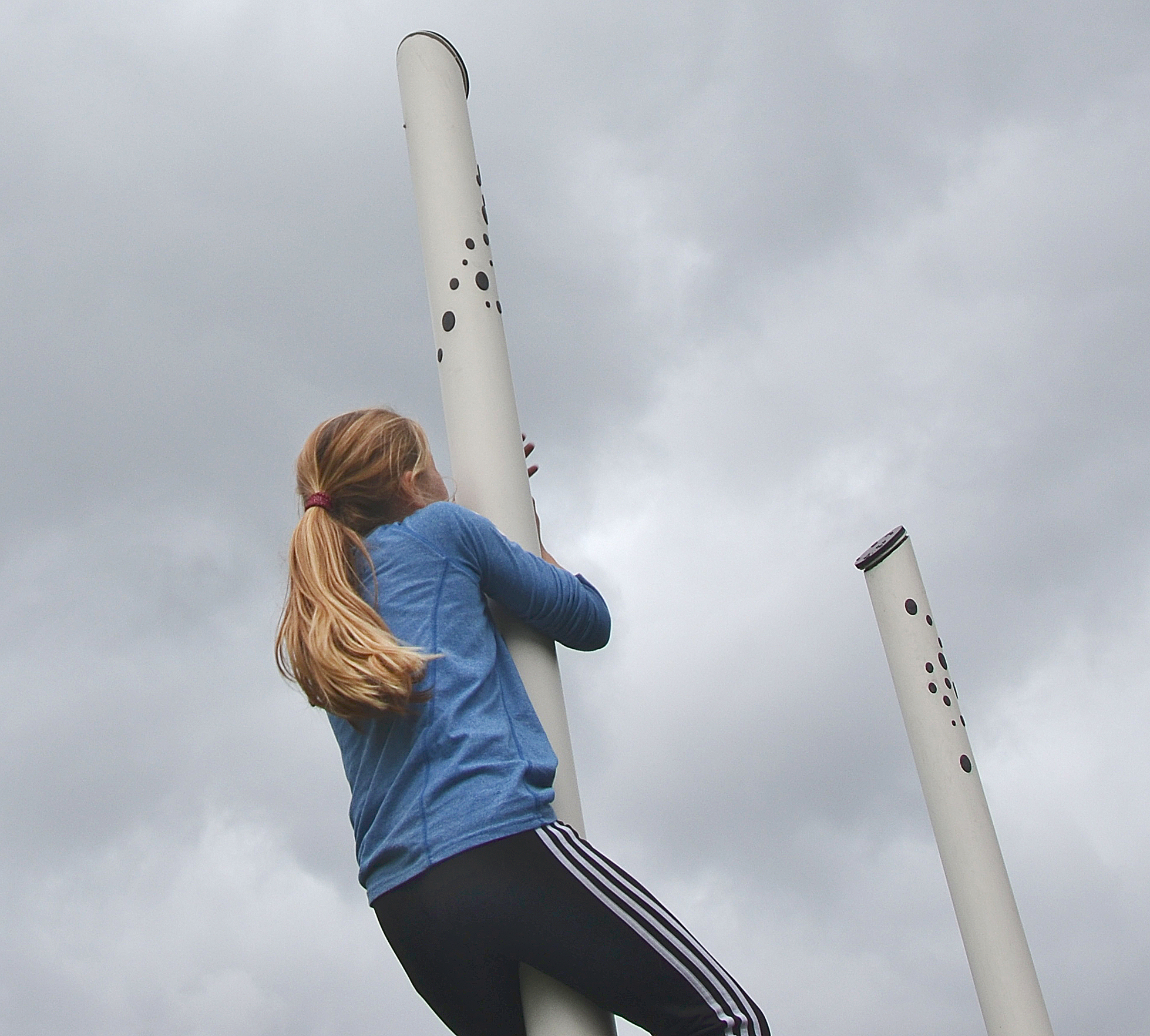 The objective was to create a playground for creative activity and a great place to simply ‘hang out’ together. It turned into a Motor Skills Park™ with many possibilities. Here, there are benches for gymnastics, running, or just relaxing. There are activity racks, pull-up bars, and two 4 meters high climbing poles.