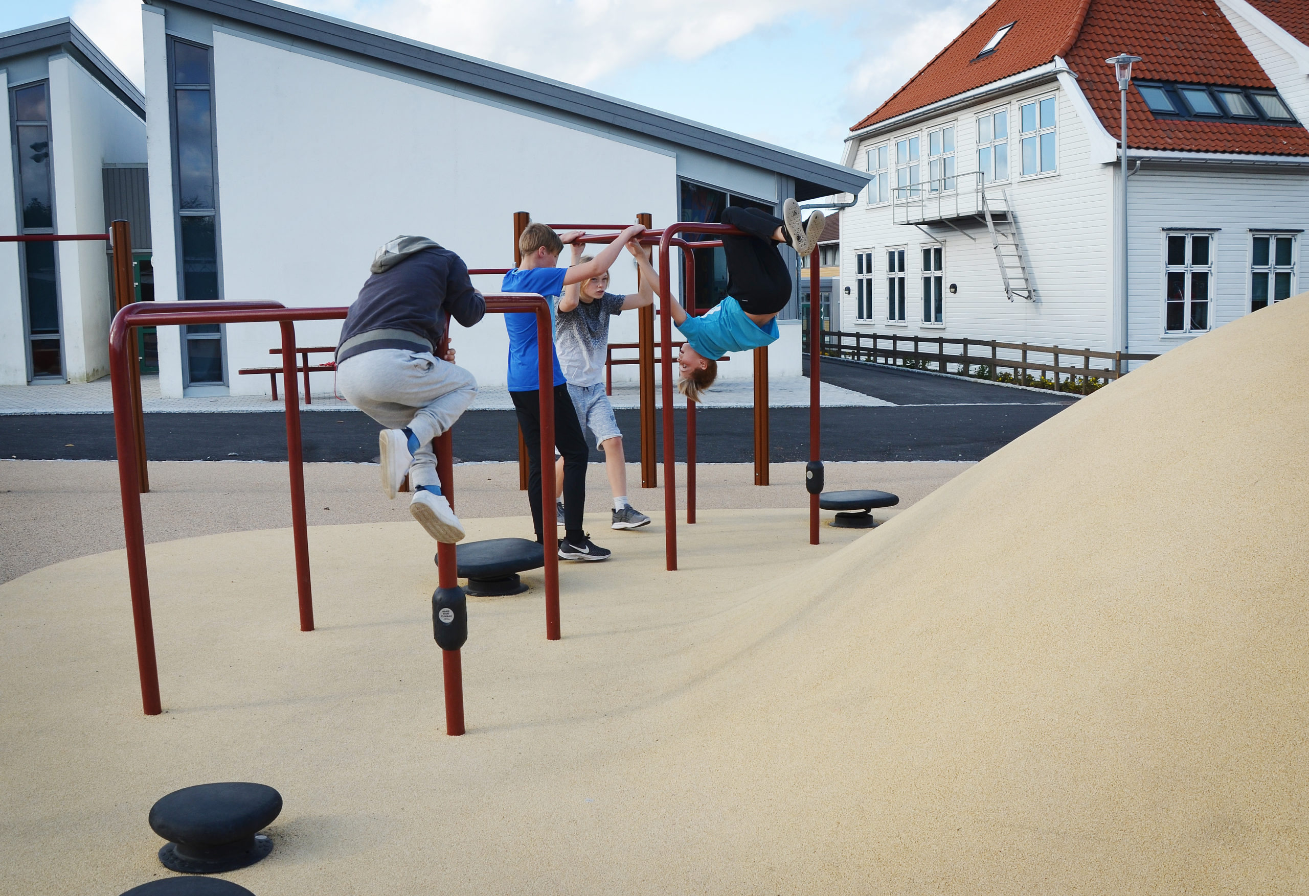 The devices can be used separately or togther as obstacle courses. We hope the students will feel a sense of mastery and enjoy themselves in creative play throughout the years at Jåtten school. See similar balance parks: Kangaroo and Don´t step into the water
