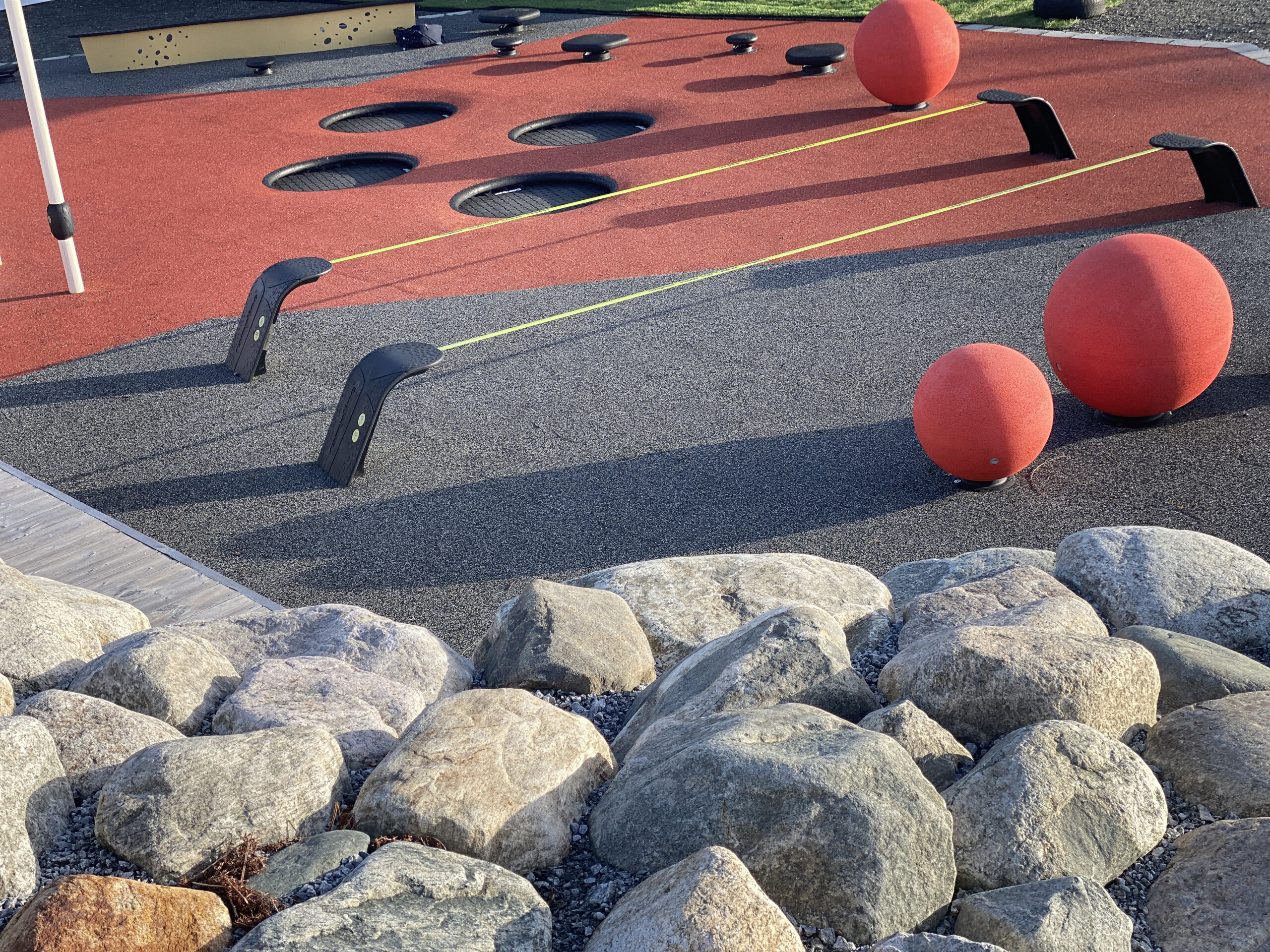 The Motor Skill Park is approximately 145 square meters. There is enough room for 15-20 children to play at the same time. In the slope between the different levels, a solid pile of rounded stones has been established, as well as a concrete and wooden bench. Around the facility, there is paving stone that provides a firm and friendly boundary to the surrounding area. The ground cover is wet pour rubber, which contributes to making the facility safe, universally designed, low-maintenance, and clean.