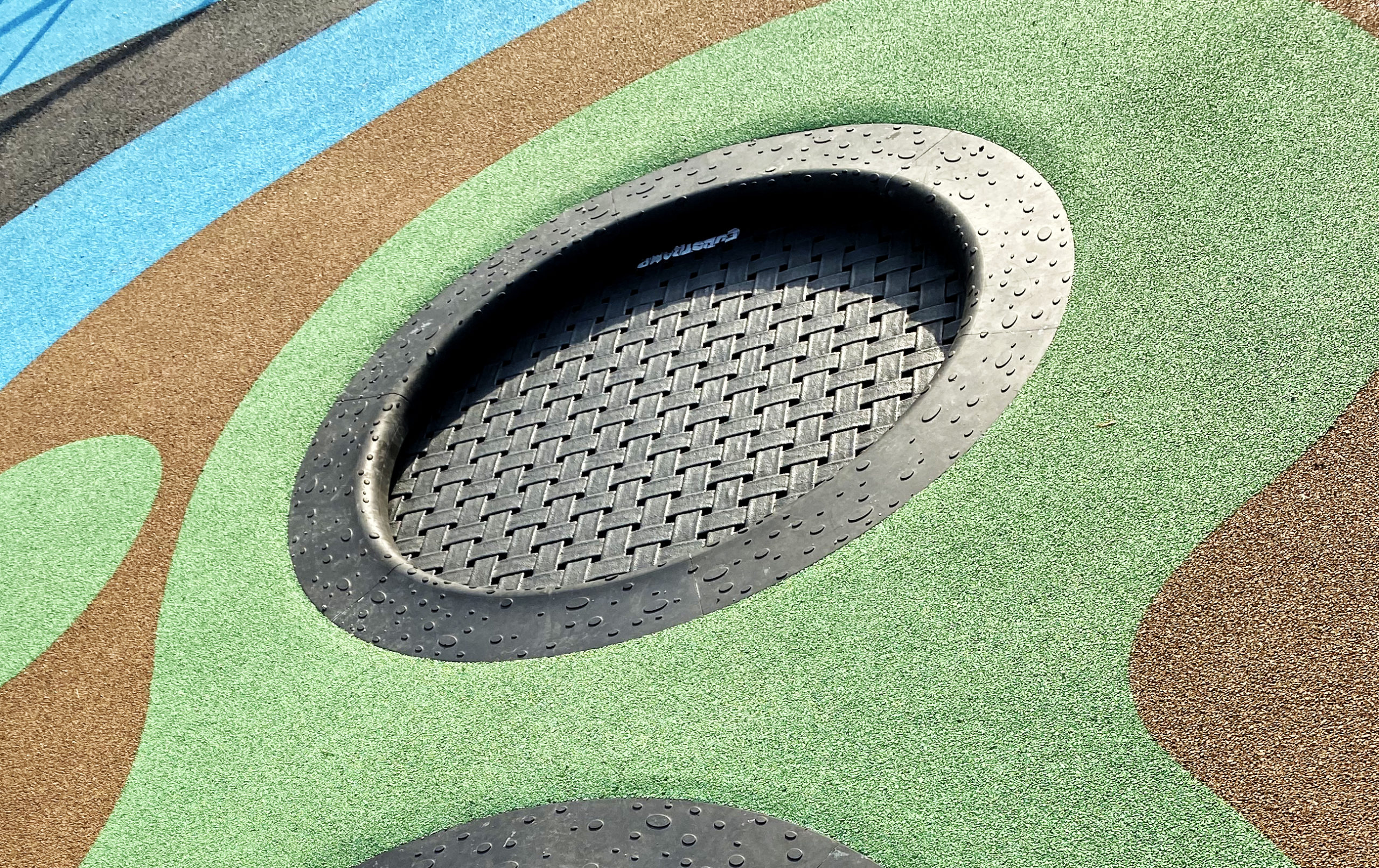The Rampline play equipment provides mixed stimulation of balance and motor skills. The slackline can be used sitting down, lying or walking and thus it challenges body and brain. Rampline’s balance balls tilt and rotate – which requires the child’s full attention. The jump pads are spring-loaded and make children jump and run while challenging their balance. Balancing the narrow balance beam feels safe due to the low height and a shock absorbing padding on top. The in-ground trampolines add opportunities for high paced play.