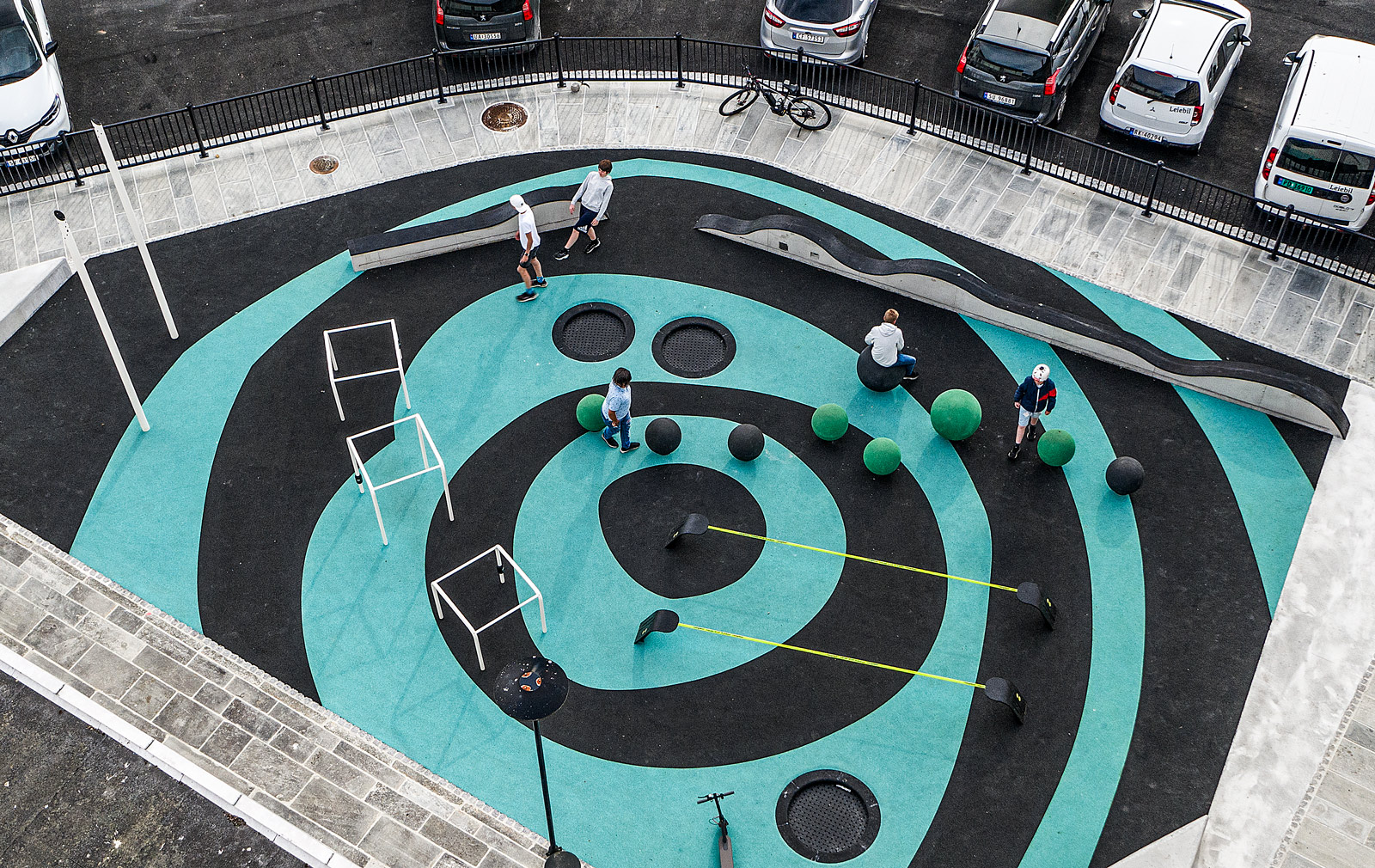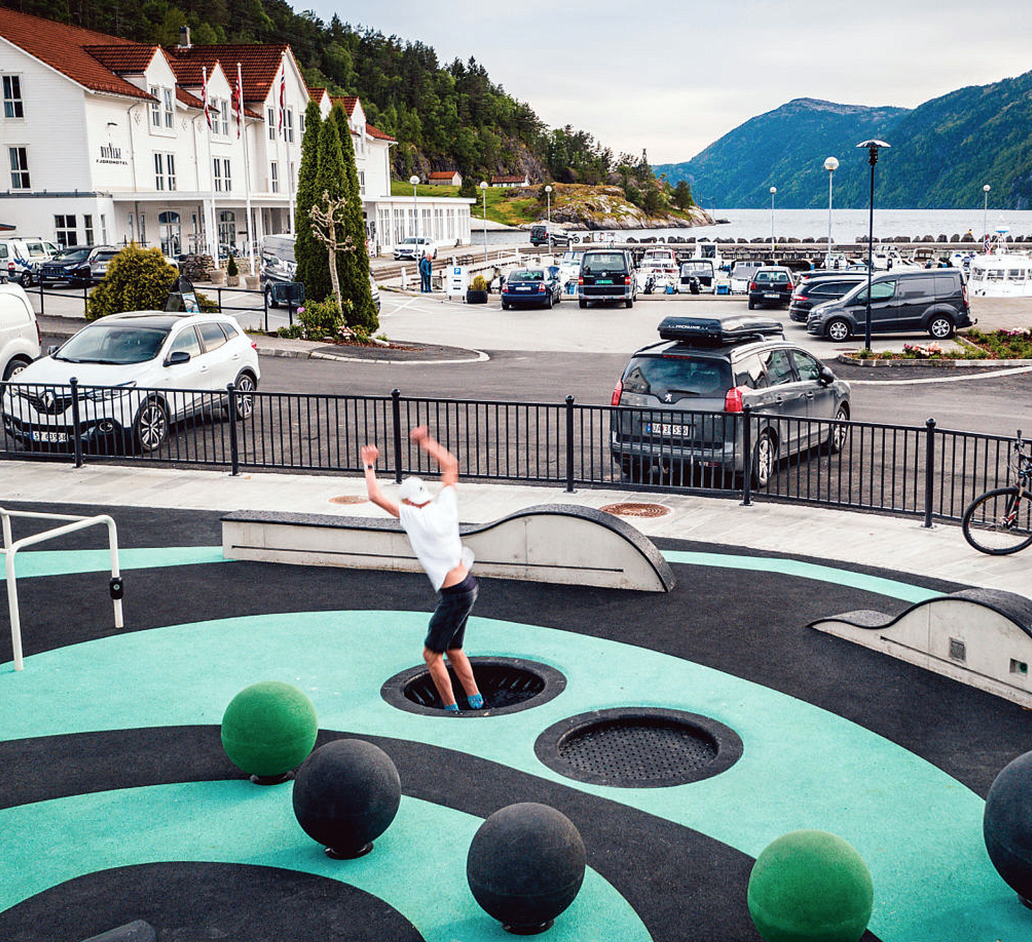 Suldal municipality has diligently worked on the development of the town center of Sand. One of the measures taken is to invest in an open and inclusive meeting place with physical activities for a wide range of ages. The result has undoubtedly increased the pulse at ‘Mejeriplatsen’ in this idyllic town in the southwest of Norway.