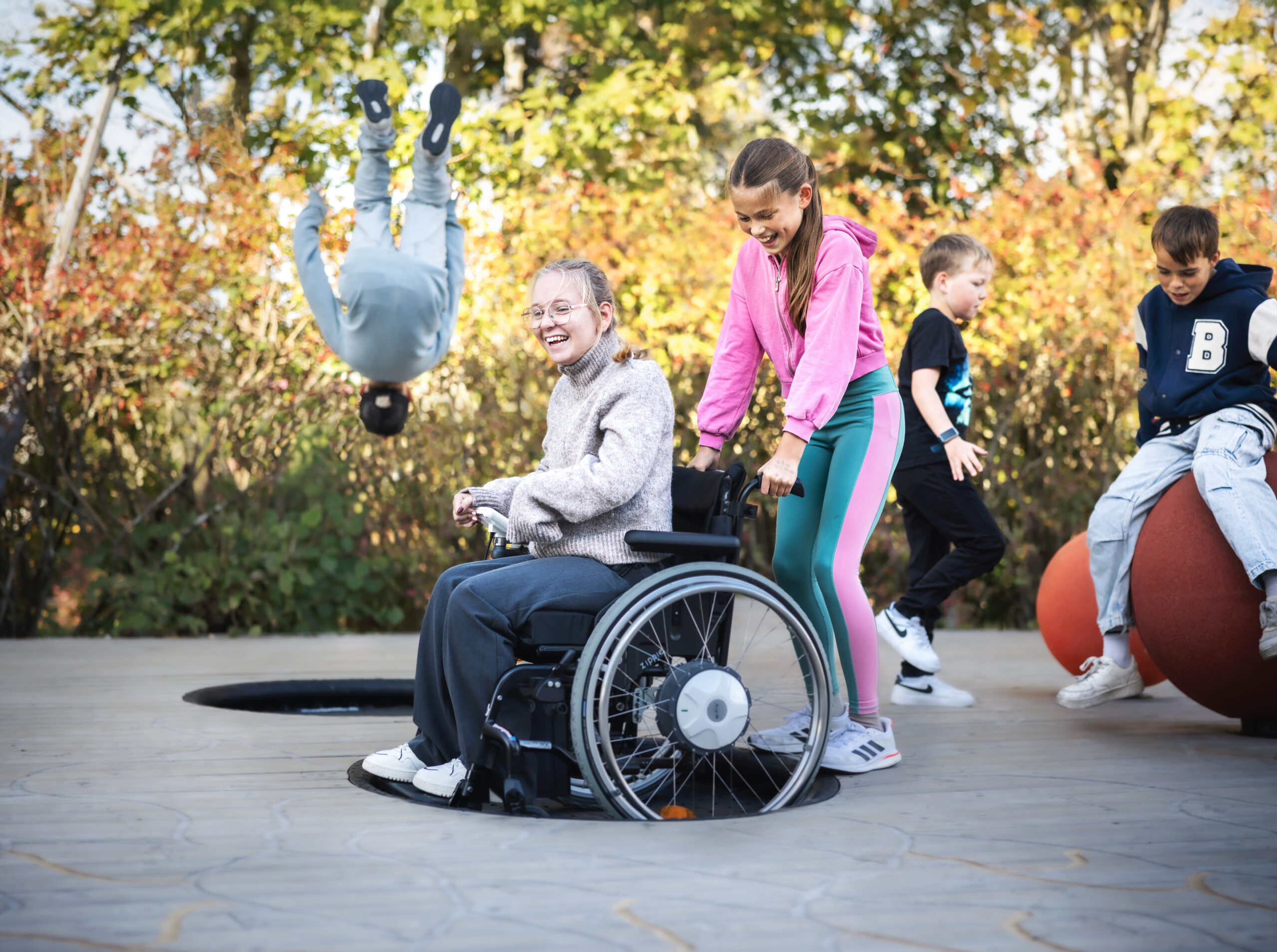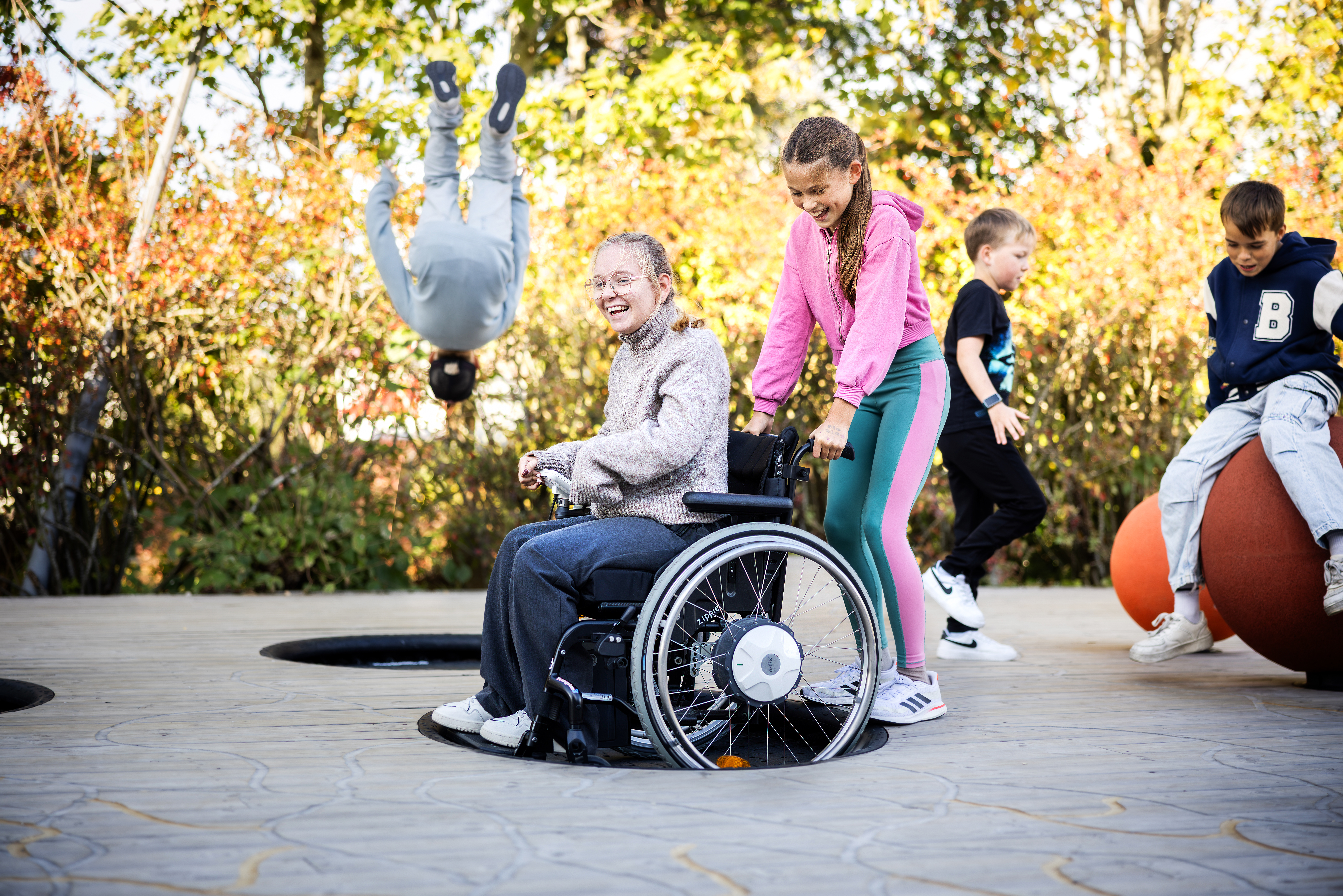 Det fine er at det finnes trampoliner med høy kvalitet, perfekt størrelse og trygg tilkomst som gjør trampolinelek brukervennlige og attraktivt på lekeplasser også for barn i rullestol.