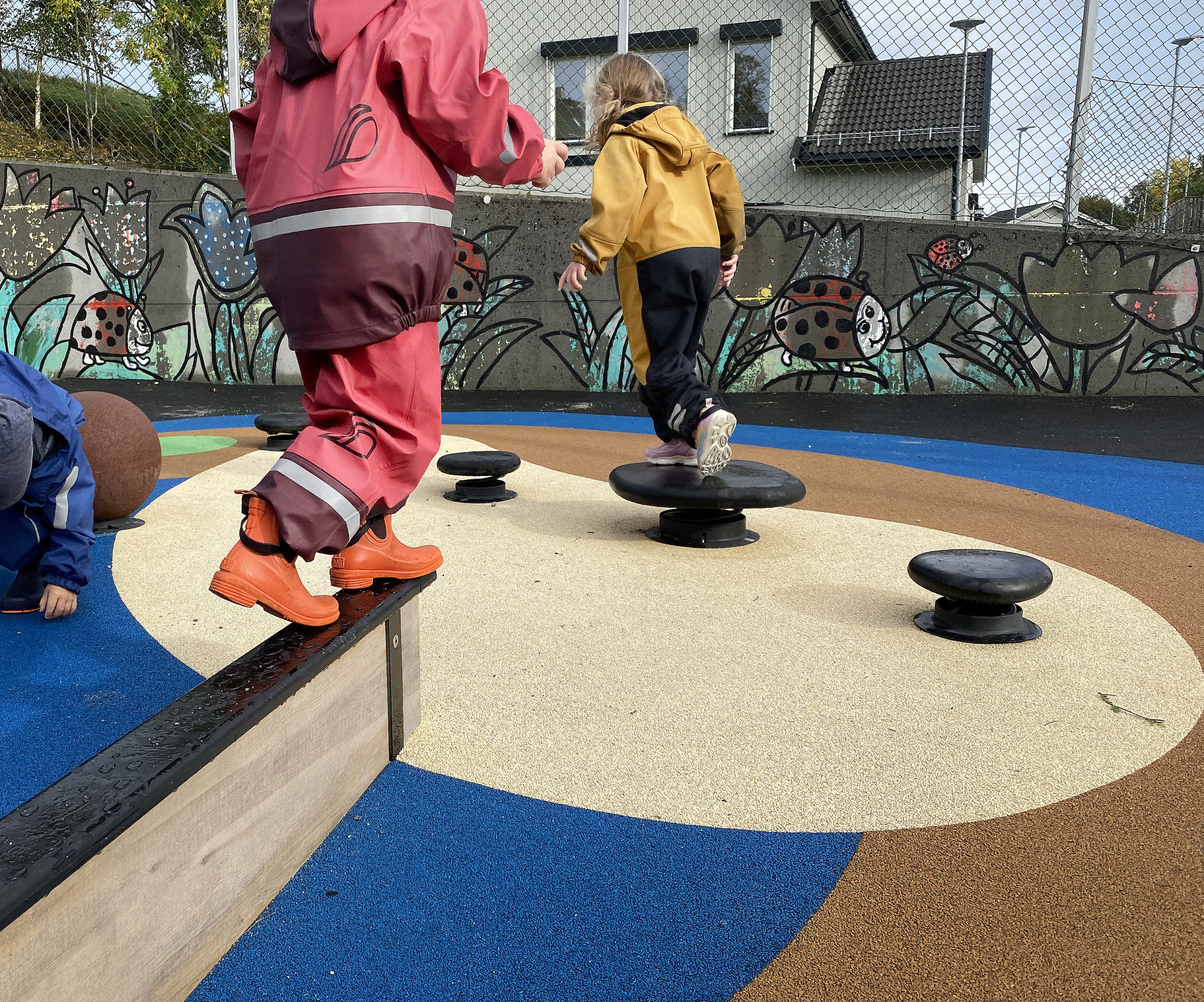Variasjon i underlag er stimulerende og innbyr til variert lek. Det skal også gjøre leken trygg og være slitesterkt. Denne lekeplassen har fått helstøpt gummidekke, asfaltbaner og belegningsstein. Gummidekket er mykt og trygt å falle på og har fått mønster og farger inspirert av øyer, gress, sand og vann. Asfaltbanen er deilig å sykle på for de små, og med små «hauger» blir det litt ekstra utfordringer. Innslag av naturstein er en rimelig måte å skape variasjon og få inn naturlige elementer. Anlegget er prosjektert og levert av Rampline, grunnarbeid i samarbeid med entreprenør Tilseth. Helstøpt gummidekke er levert av Safeplay