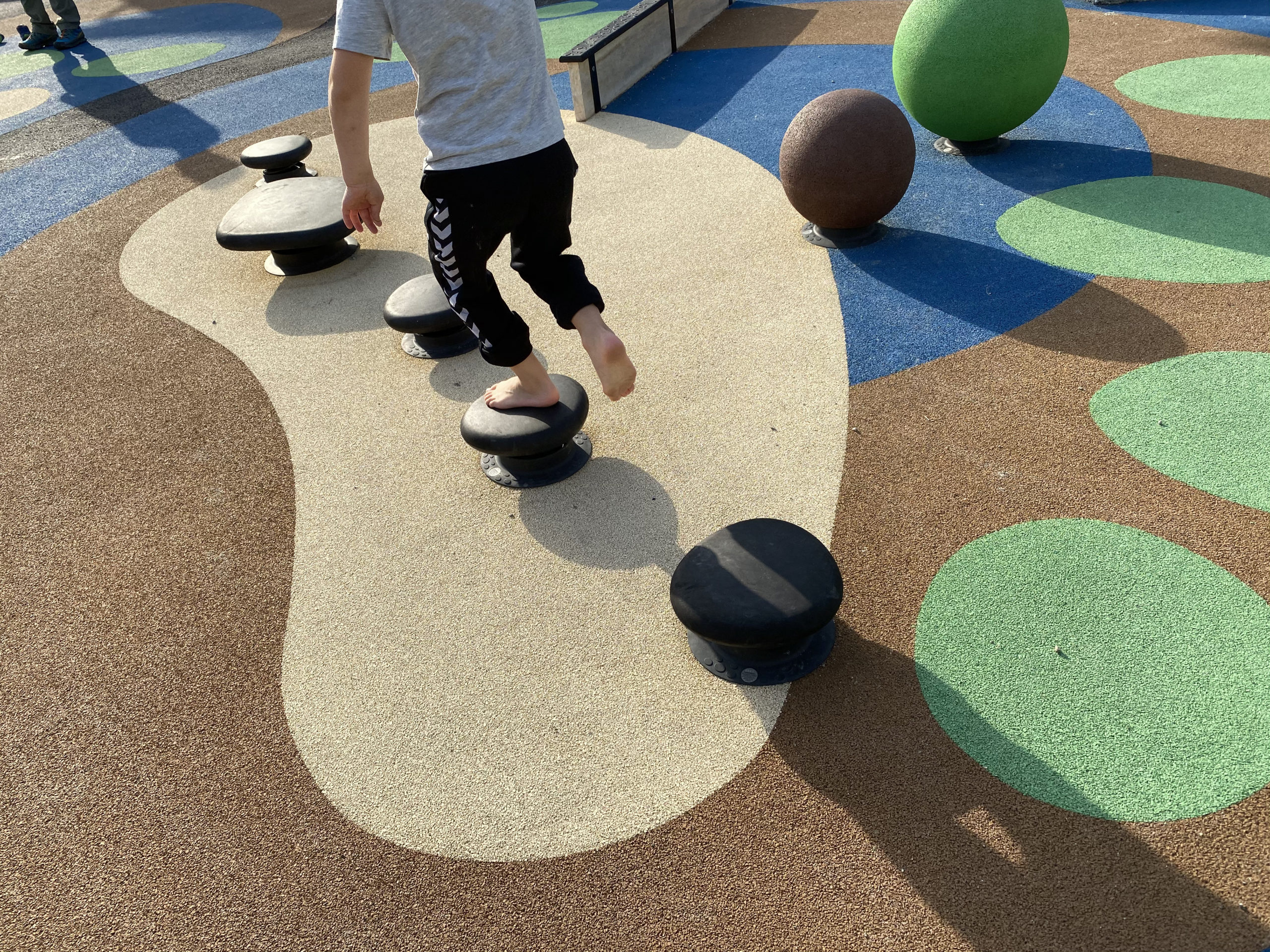 - Balancebuddy (balansbommen) och Jumpstone (hoppstenen av naturgummi) blir spännande element i en liten hinderbana. Att hoppa från sten till sten och vidare över en stock utlöser spänning och ger en känsla av att lyckas.